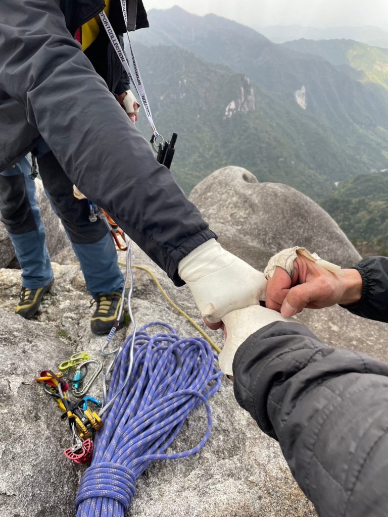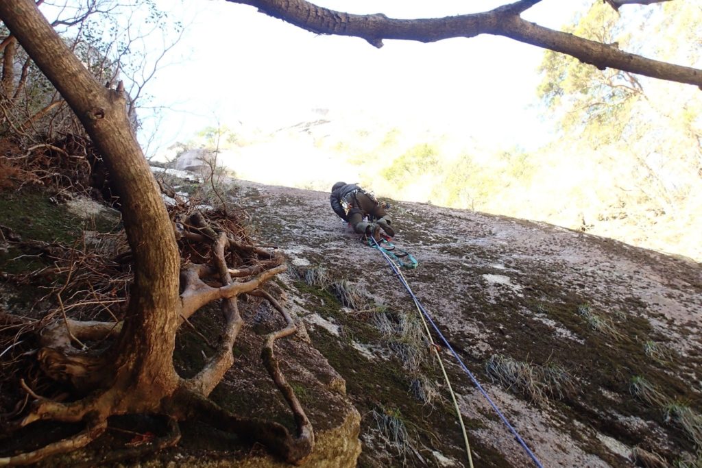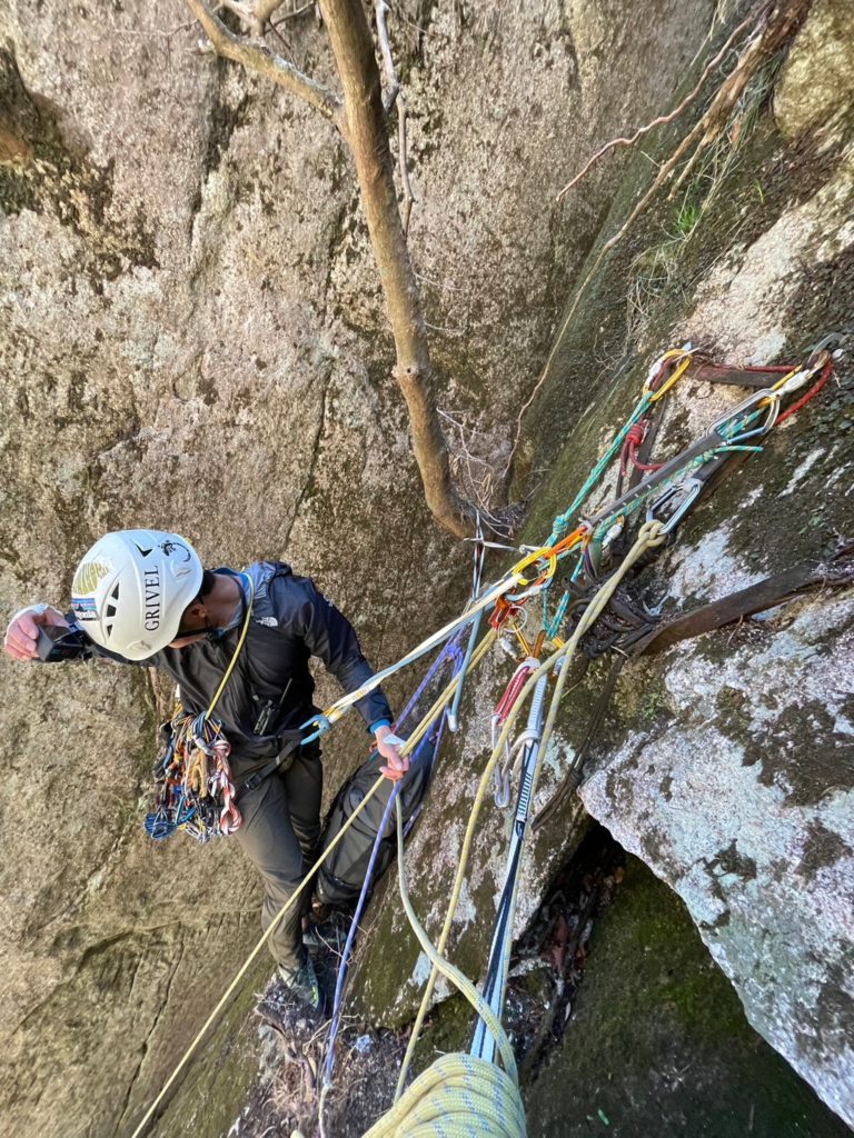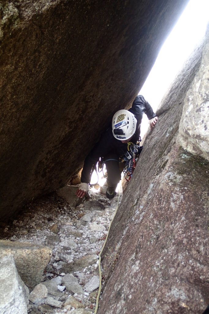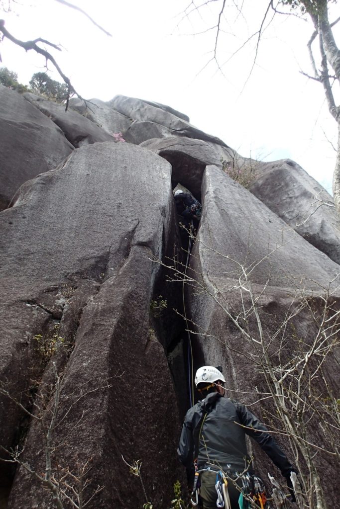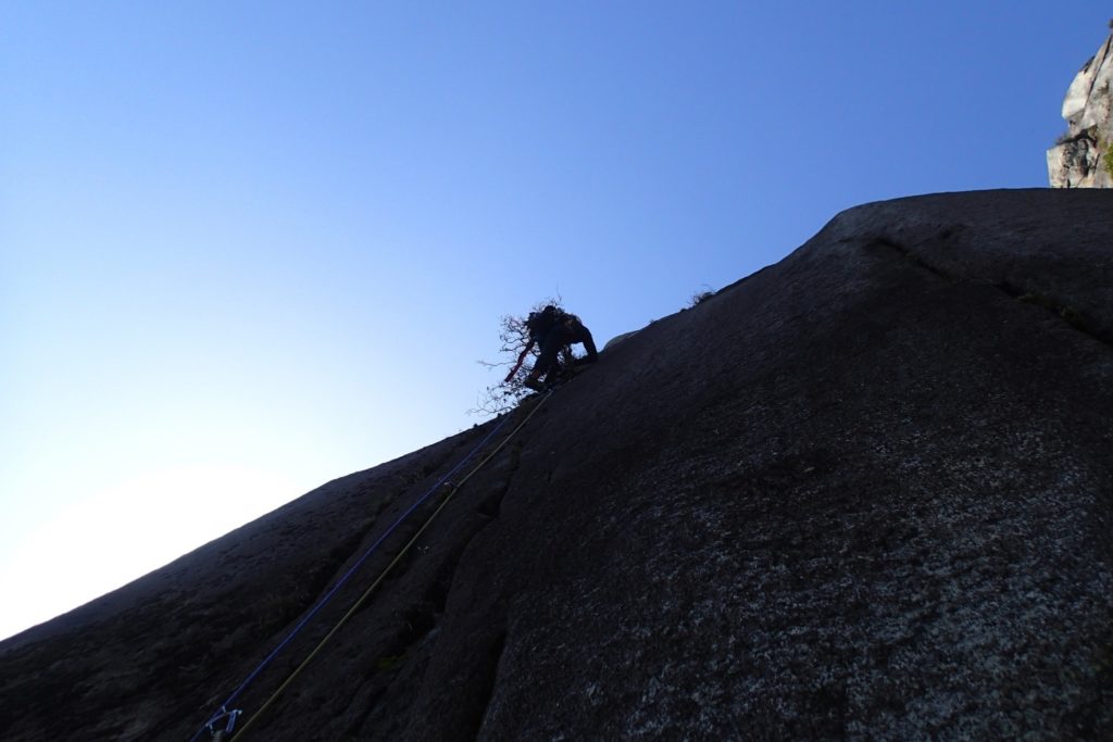 サイの角上 クイックドローを回収するとトラバース分振られるので慎重に ロープが花崗岩にズリズリ擦っているのが気色悪い