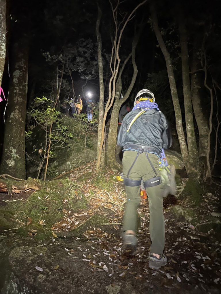 樹林帯に入ったのでロープを解いて歩いて6P取付きを探す 取付きで行動食を取りしばし休憩