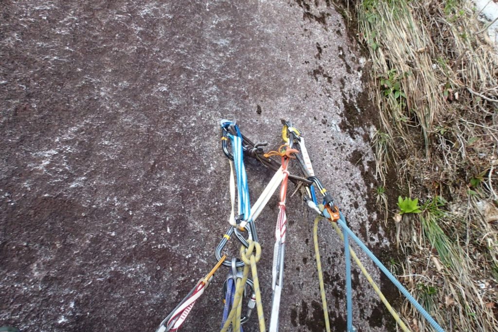 リングボルトにアブミの架け替え 2/3ほどでリングボルトが抜けていて、スカイフックも決まらず下降しつつ左の草付きに入る。