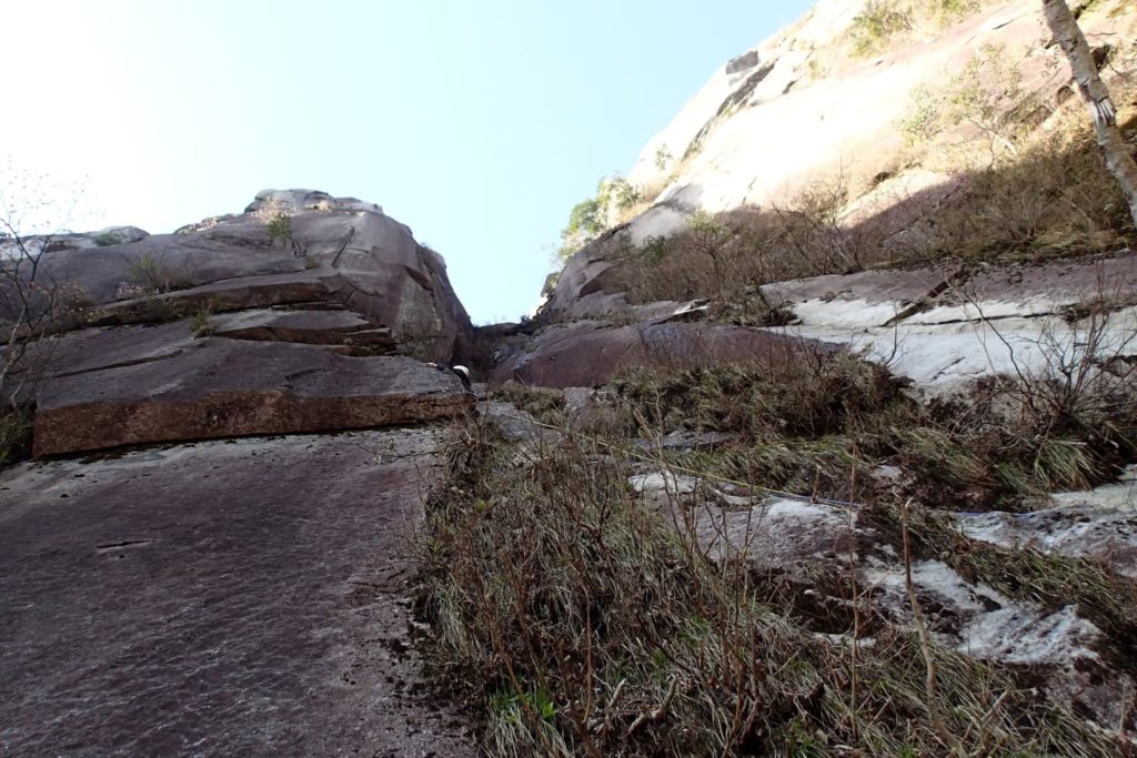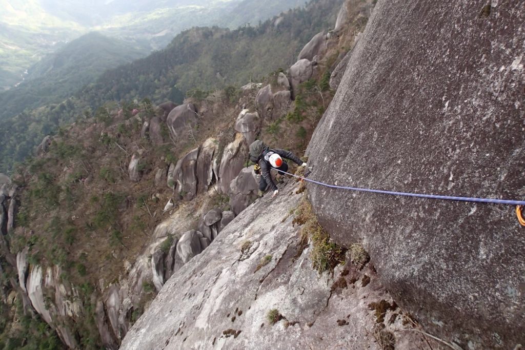 スラブをトラバース5m リングボルト3個 リングボルトにスリングを掛け次のボルトに向かう 花崗岩の表面が風化しフレーク状にボロボロと崩れる リッジを乗り越し凹角に入りカム3個リングボルト1個でピッチを切る